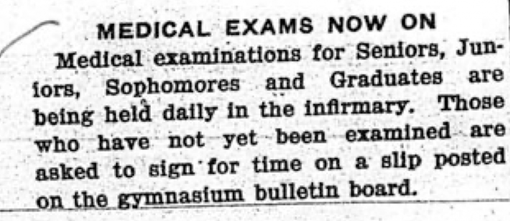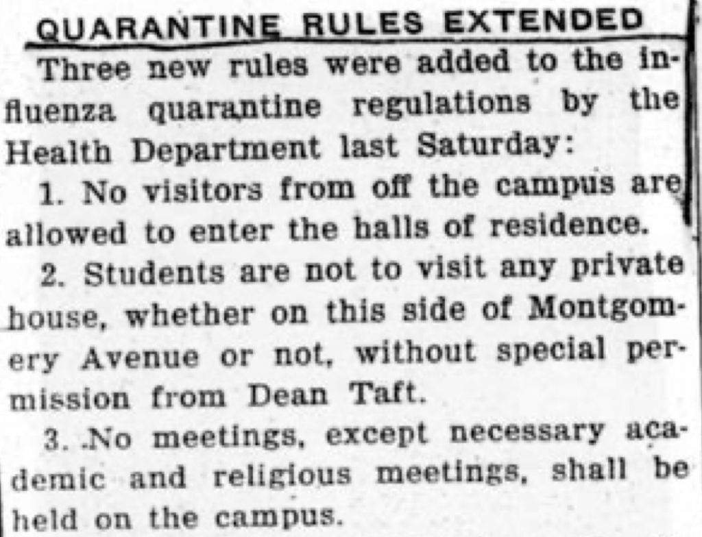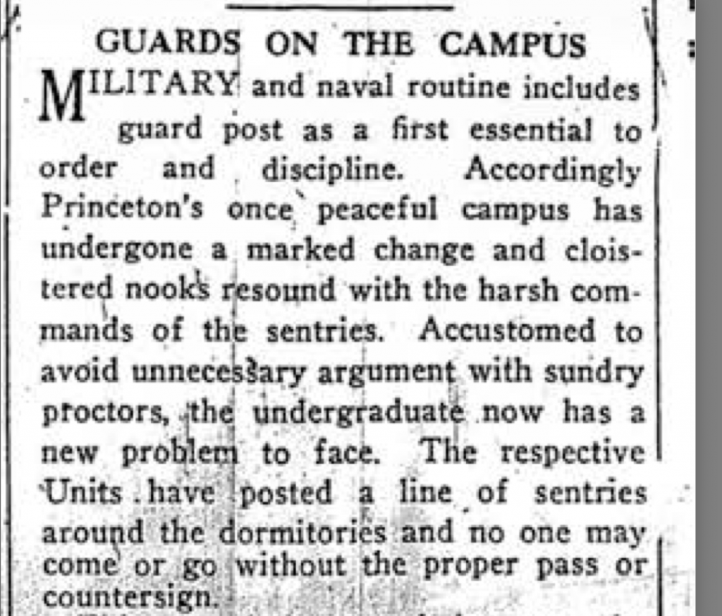 At the time of epidemic (1918), the borough of Princeton had roughly 7,000 people. Princeton University’s population was only 1/7th of the population. When cases began to rise in the borough, measures inside the campus were strict. Freshmen became incident officers and were easily identifiable because they wore a handkerchief around their wrist. They could stop students from loitering around the popular Nassau street. A strict vigil was enforced. Only one death was reported (of a professor). Of all the Influenza Escape Communities, (7-8 of them total in the US), Bryn Mawr College is one that tops the list.